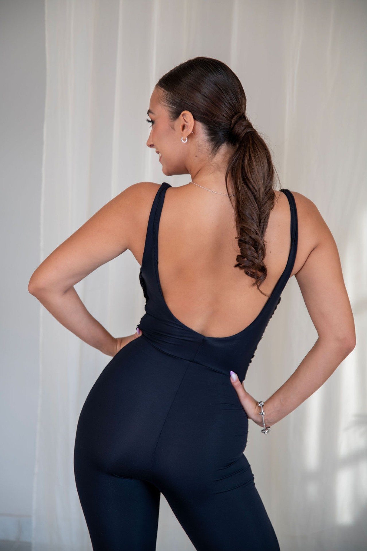 - időtálló, visszafogott fekete overál, fekete pöttyös necc csavarral