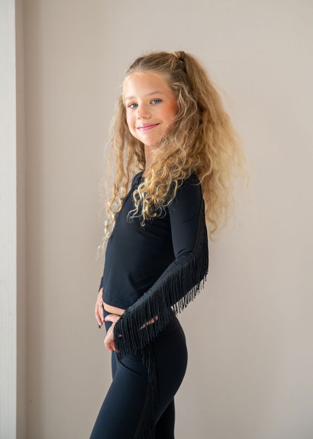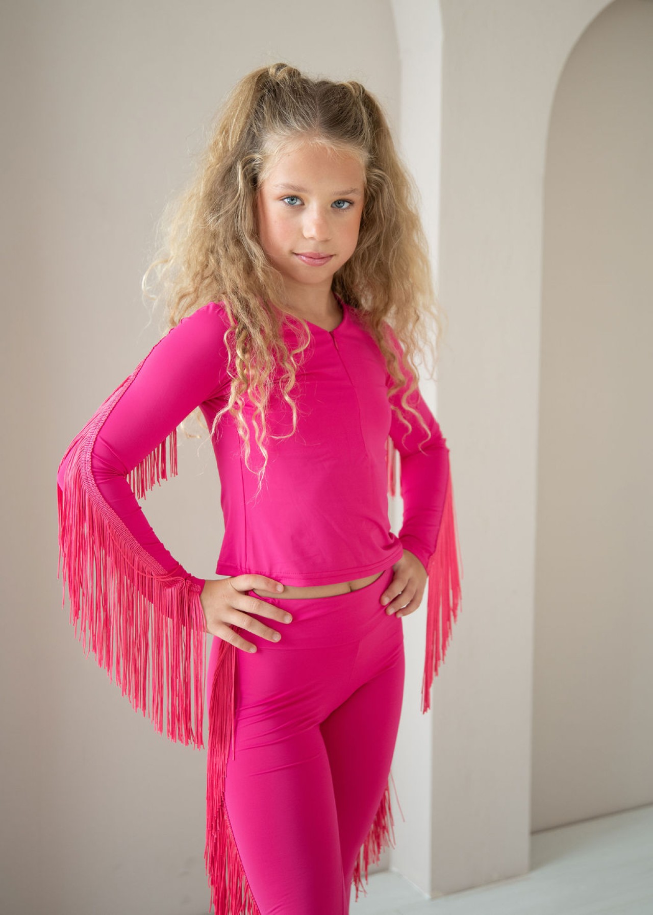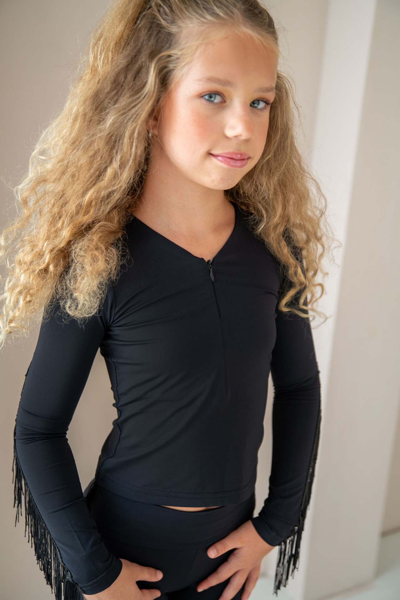 - felső hosszú ujjait 10cm-es rojttal tesszük érdekesebbé, ami mozgás közben életre kel